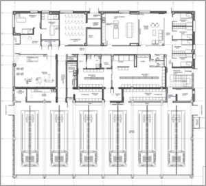 El proyecto se compone de dos zonas bien diferenciadas, pero conectadas, la de servicios (con planta sótano para instalaciones y planta baja) y el hangar para vehículos (de una sola planta).