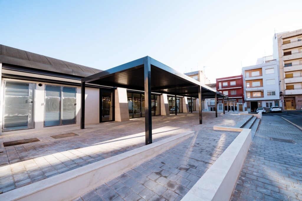 Remodelación completa del Mercado Central de Yecla, con una superficie total de 1800m2 de superficie, dedicados a la venta de productos, además de un restaurante, bar y una escuela de formación para hosteleros. Además, se han renovado también las terrazas cubiertas.